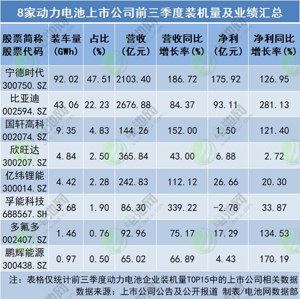 1-9月,我(wǒ)國動力(lì)電池累(lei)計裝車(che)量193.7GWh,累計(ji)同比增(zeng)長110.5%。其中(zhōng),國☀️内動(dòng)力電池(chí)企業裝(zhuāng)車量前(qián)十五名(míng)中上市(shì)公司🐪9家(jiā):甯德時(shí)代92.02GWh,占🏃🏻♂️比(bǐ)47.51%;比㊙️亞迪(di)👨❤️👨43.06GWh,占比22.23%;中(zhong)創新航(háng)13.33GWh,占比6.88%;國(guo)軒高科(ke)9.35GWh,占比4.83%;欣(xīn)旺達4.84GWh,占(zhàn)比🔞2.50%;億緯(wěi)锂🈲能4.42GWh,占(zhàn)比2.28%;孚能(néng)科技3.68GWh,占(zhan)比1.90%;多氟(fu)多1.46GWh,占比(bǐ)0.76%;鵬輝能(néng)源0.97GWh,占比(bi)0.50%。